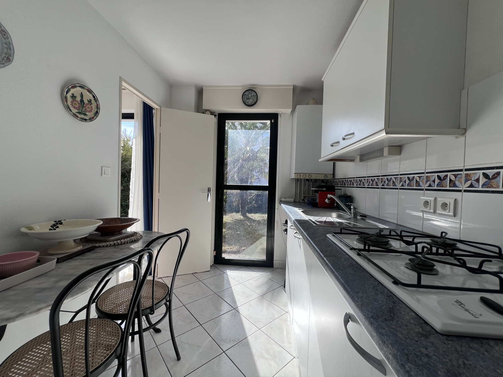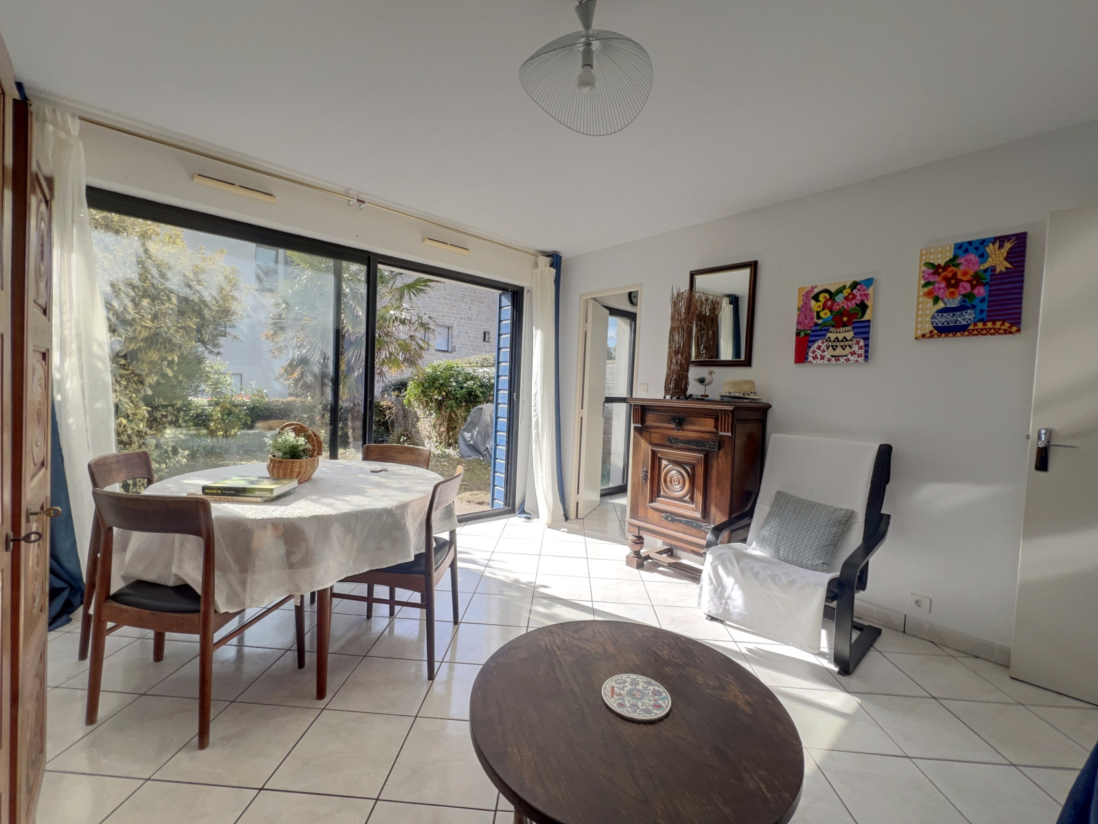Entre Bourg et Plage, dans un environnement parfaitement au calme, cet appartement deux pièces de 45m² est en rez de jardin.