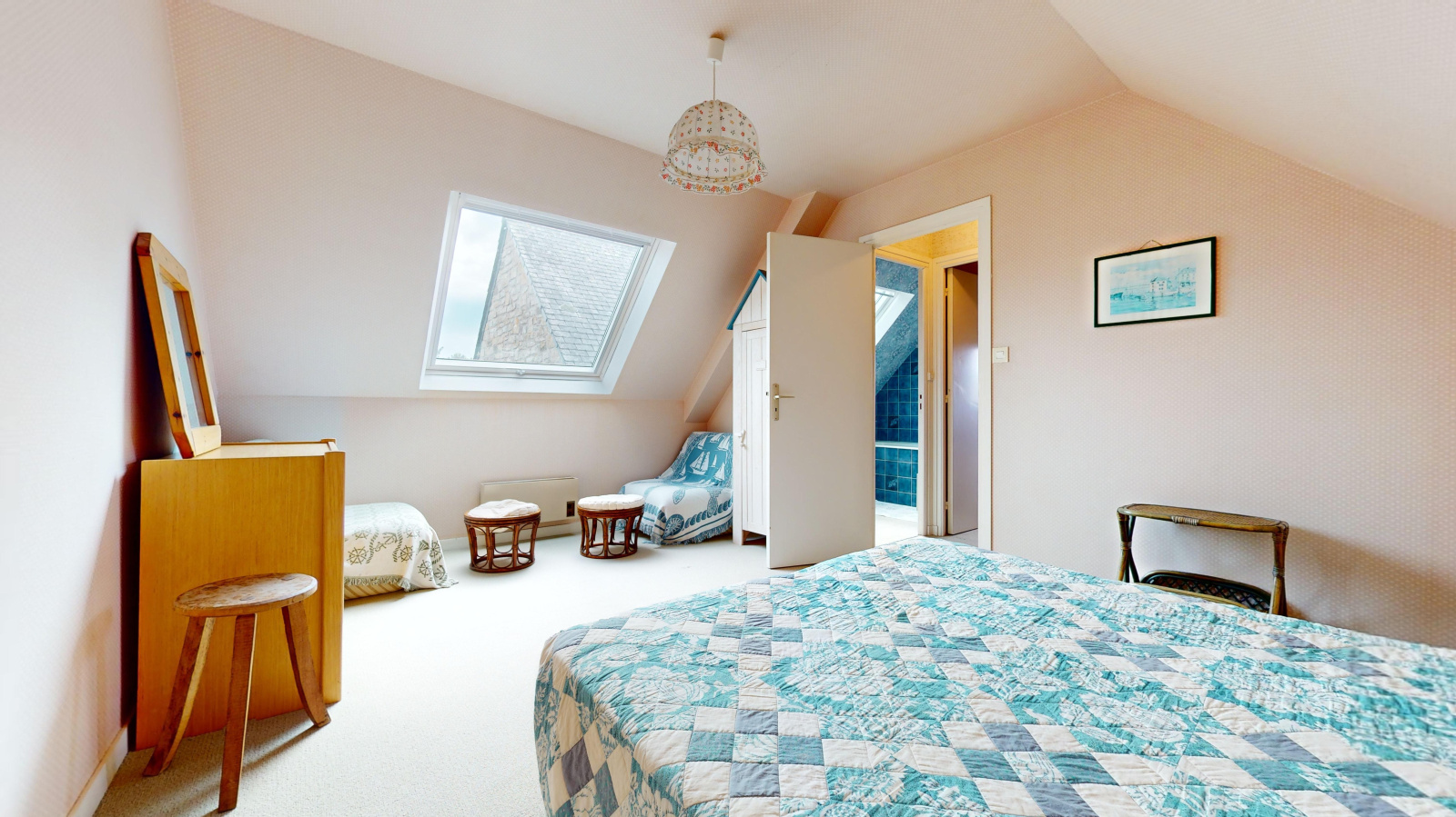 Au 1er : une belle chambre, un coin nuit et une salle de bain.
