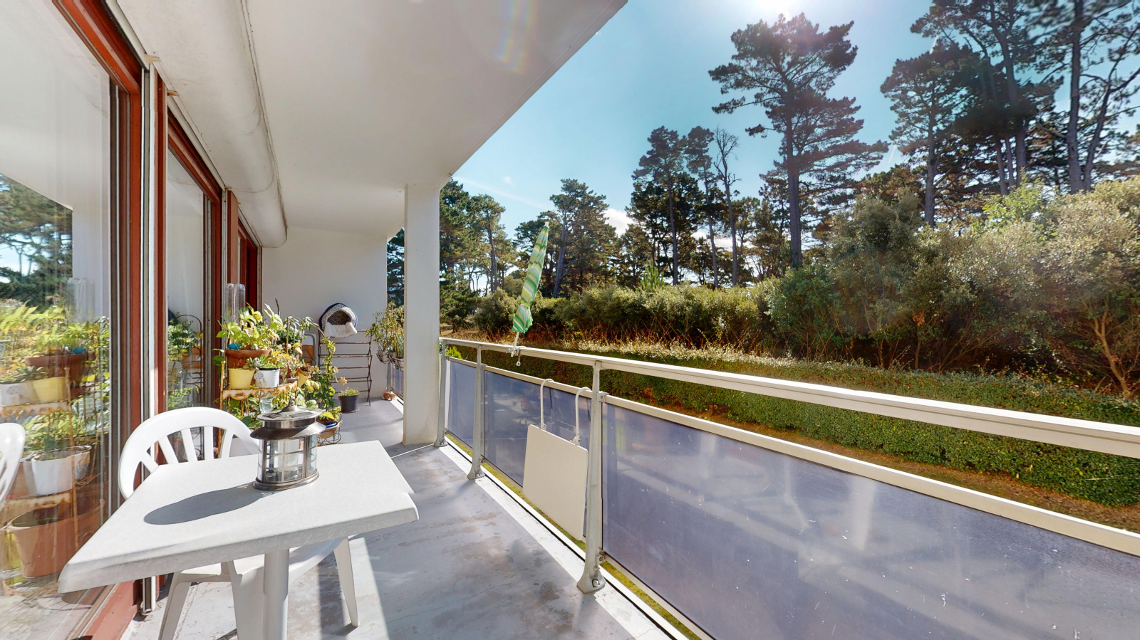 Salon cuisine ouvert sur la terrasse, deux chambres dont une donnant sur la terrasse, spacieuse salle de bains, wc indépendant, très belle terrasse de 13 m² donnant sur les pins, cave et parking extérieur.